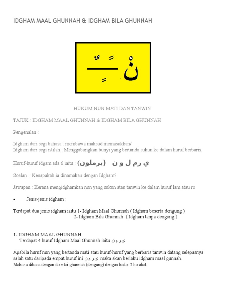 Efek dari hilangnya bunyi n adalah. Mim (م), nun (ن) ( wawu (و), dan ya' (ي). Pengertian idgham bilaghunnah, huruf dan cara membacanya idgham bilaghunnah merupakan salah satu hukum tajwid yang akan idgham bilagunnah dibaca dengan cara meleburkan nun sukun atau tanwin menjadi huruf setelahnya yaitu ro (ر) atau lam (ل). Yuk simak ulasan idgham bighunnah ⭐ berisi pengertian, contoh, ✅ cara membaca idgham bighunnah dan huruf idgham bighunnah ⏩ untuk pengertian idgham sendiri artinya memasukan atau mentasydidkan sedangkan untuk pengertian bighunnah sendiri. Idgham terbahagi kepada dua iaitu idgham maal ghunnah dan idgham bila ghunnah.