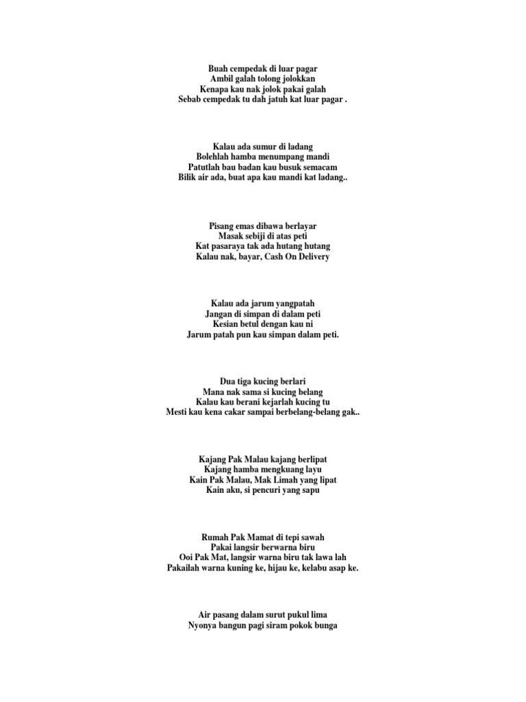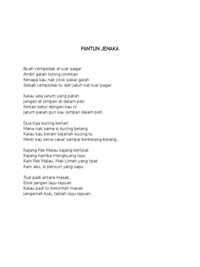 Pantun Lawak from imgv2-1-f.scribdassets.com Temukan lagu terbaru favoritmu hanya di lagu 123 stafaband planetlagu. Kajang pak malau kajang berlipat kajang hamba mengkuang layu kain pak malau, mak limah yang lipat kain aku, si pencuri yang sapu. Hj norashid hj ahmad 9 years ago. Rumah pak mamat di tepi sawah pakai langsir berwarna biru ooi pak mat, langsir warna biru tak lawa lah pakailah warna kuning ke, hijau ke, kelabu asap ke. Kajang pak malau kajang berlipatseri mersing flv. 'kajang pak malau kajang berlipat, kajang hamba mengkuang layu; List download link lagu mp3 kajang pak malau by (maizatul akmam mahmood), last update jun 2018. Kain pak malau mak limah yang lipat, kain aku si pencuri yang sapu.